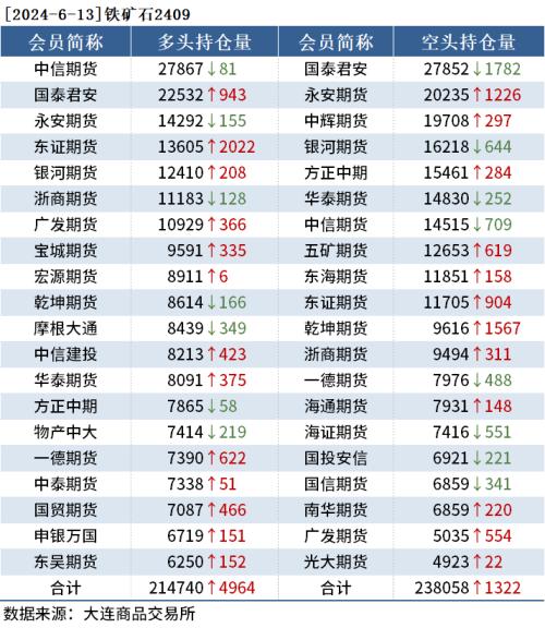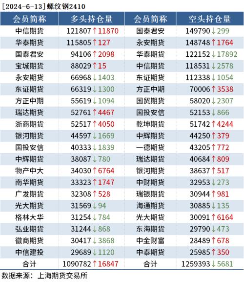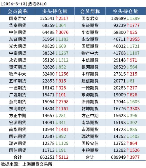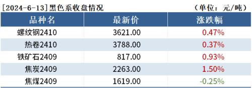截至6月13日收盘,螺纹钢2410收3621元/吨,涨0.47%;热卷2410收3788元/吨,涨0.37%;铁矿石2409收817元/吨,涨0.93%。