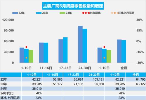 6月1-10日,乘用车市场零售36万辆,同比去年同期下降8%,较上月同期下降23%;今年以来累计零售843.3万辆,同比增长5%。