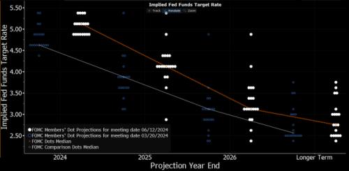 这无疑比美联储官员在他们最新6月点阵图中预测的更为鸽派——他们的中位数预测是今年降息一次,低于3月份会议上所预计的三次。