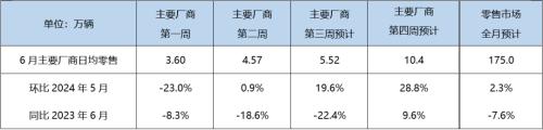6月第一周包含了完整的端午假期,交车节奏相较去年同期略有后移,第一周日均零售3.60万辆,同比-8.3%,环比-23.0%。第二周日均零售4.57万,同比-18.6%,环比0.9%。第三周伴随“618”活动造势,各厂商营促销进一步发力,市场热度有所恢复,预计日均零售5.52万,同比-22.4%,环比19.6%。考虑到厂商冲击半年目标及二季度财报,预计第四周日均零售10.41万,同比增长9.6%,环比28.8%,综合估算6月零售可达到175万辆。