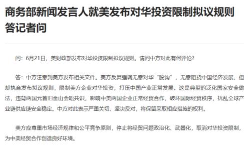 商务部新闻发言人就美发布对华投资限制拟议规则答记者问。