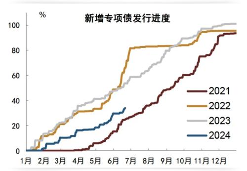 业内某机构高管对财联社表示,“很明显能感受到某些地区的财政到位资金上半年是减少的,这和2023年底增发的万亿国债消耗了较多前期储备的项目有关,与此同时,在地方政府对债务管控采取了更为审慎的态度下,新一轮审批时还需关注此前申报项目的资金使用情况,不过随着经济增速的诉求在加大,下半年发行进度也将会感受明显”。
