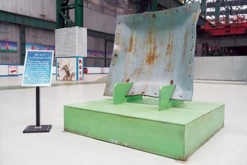 图为经受8公斤TNT炸药爆破后的普阳钢铁700兆帕级高强韧防爆钢板,在该公司中板车间展示。(普阳钢铁供图)