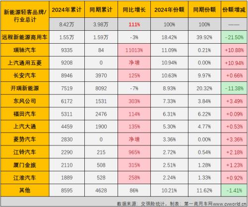 在连续三个月销量突破2万辆后,2024年新能源轻客累计销量已突破8万辆大关。2024年1-5月,新能源轻客市场累计销售8.42万辆,同比增长111%,累计销量增幅较4月过后(+115%)略有下降。