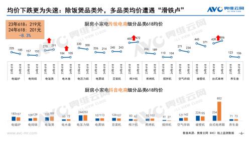即便消费端的热情再减淡,但平台间、品牌间的争夺从未停止,拼产品、拼价格、拼服务、拼物流等各方面,其中价格再度成为无论是平台还是品牌的最核心“杀手锏”。奥维云网(AVC)线上传统电商监测数据显示,2023年“618”促销期全品类厨房小家电市场均价为219元,而在2024年的“618”促销期内该均价险跌200元,均价为201元,同比大幅下降8.3%。分品类来看,多数品类均价呈现明显性下滑,包含主流品类:电磁炉、电压力锅、空气炸锅、破壁机等;长尾细分场景品类也难逃价格竞争的波及,依靠性价比带动销量的品类不少,如电炖锅、养生壶、搅拌机等;这里我们特别注意的是到最大规模小家电品类电饭煲均价依然屹立不倒,从去年开始在品类功能升级及材质升级的基础背景下品类均价不断提升较去年同期“618”同比提升7.8%。