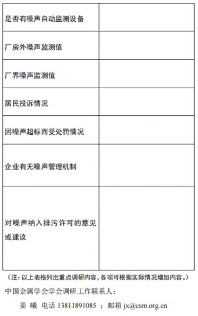 受生态环境部环境工程评估中心的委托,中国金属学会拟在钢铁企业开展噪声管理现状调研,为后期制定《排污许可证申请与核发技术规范工业噪声》提供基础工作。请各企业在调研中给予配合并填报《噪声污染现状调研表》,以便企业在生产运行中合理调度,控制噪声污染,实现环境安全。