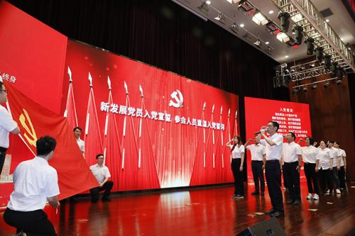 6月26日,中国宝武武钢集团党委召开庆祝建党103周年座谈会暨“两优一先”表彰会。2023年初以来,武钢集团“坚持质量与数量并重,严把入口关;坚持培训与教育并行,加强培养关;坚持监督和审查并进,突出审核关”,共发展党员38人。图为武钢集团领导带领部分新发展党员进行入党宣誓,全体参会党员集体重温入党誓词现场。