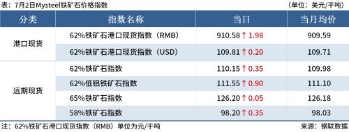 ◎7月2日,Mysteel62%铁矿石指数110.15,涨0.35,月均109.98;65%铁矿石指数126.20,涨0.05,月均126.18。(单位:美元/干吨)