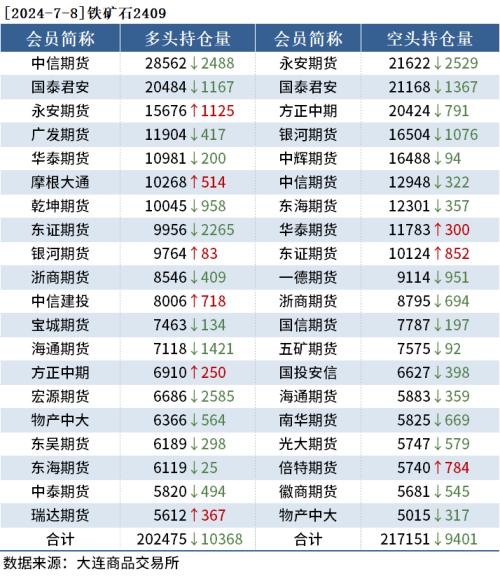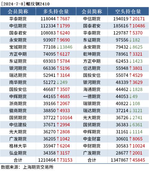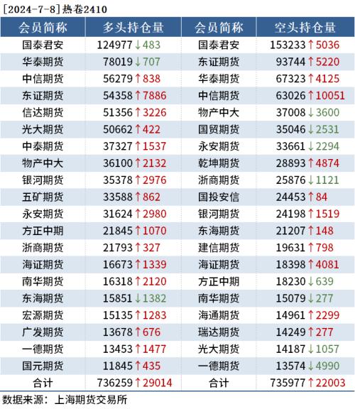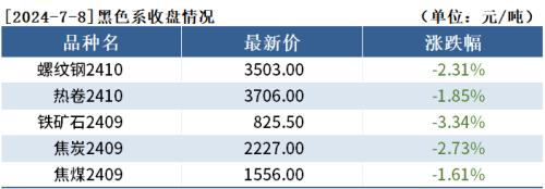 截至7月8日收盘,螺纹钢2410收3503元/吨,跌2.31%;热卷2410收3706元/吨,跌1.85%;铁矿石2409收825.5元/吨,跌3.34%。