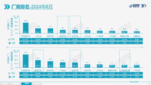 6月自主品牌零售103万辆,同比增长10%,环比增长5%。当月自主品牌国内零售份额为58.5%,同比增长9.3个百分点;2024年自主品牌累计份额57%,相对于去年同期增加7个百分点。6月自主品牌批发市场份额64.8%,较去年同期增长11.2个百分点;自主品牌在新能源市场和出口市场获得明显增量。头部传统车企转型升级表现优异,比亚迪、奇瑞汽车、吉利汽车、长安汽车等传统车企品牌份额提升明显。