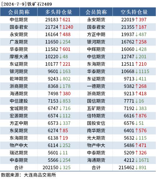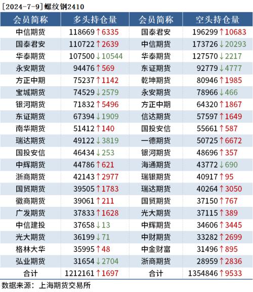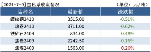 截至7月9日收盘,螺纹钢2410收3515元/吨,跌0.51%;热卷2410收3711元/吨,跌0.62%;铁矿石2409收834.0元/吨,跌0.48%。