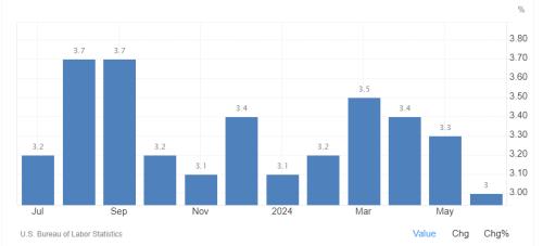 纽市早盘公布的数据显示,美国6月未季调CPI年率录得3.0%,低于市场预期的3.1%,回落至去年6月以来最低水平;季调后CPI月率录得-0.1%,2020年5月以来首次录得负值。