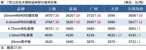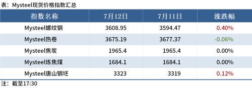 ◎7月12日,247家钢厂高炉开工率82.5%,环比上周减少0.31个百分点;高炉炼铁产能利用率88.7%,环比减少0.38个百分点;钢厂盈利率36.8%,环比减少7.79个百分点。