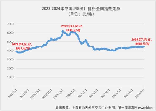 与此同时,影响天然气重卡市场的另一大因素——气价,在2024年也给天然气重卡市场送出“助攻”。2023年12月,LNG平均气价约6000元/吨左右,最高时超过6200元/吨,燃气重卡的经济性优势在2023年年末已明显下降;进入2024年,天然气价格从1月份平均5300元/吨左右,下降至4月份最低时的4000元出头/吨,随后气价开始回升,5月份和6月份气价分别在4300元/吨和4400元/吨上下(如下图),相对去年年末仍算是一个很友好的价格。这对燃气重卡购车意愿有一定的刺激作用,最近4个月平均超2万辆的终端销量,也印证了气价对燃气重卡的影响。