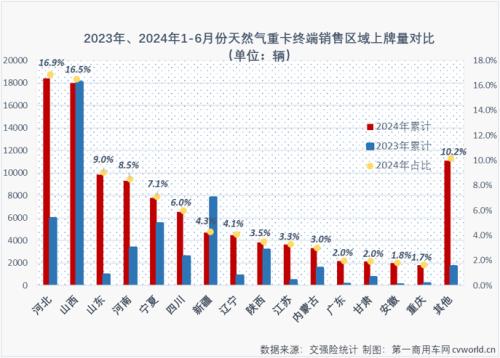 从终端销售区域来看,2024年1-6月,全国31个省(市、自治区)都有天然气重卡挂牌上路,区域分布仍呈现极不均衡的状态,河北、山西、山东、河南等资源型物流运输大省,“接收”了天然气重卡终端市场多数销量(如下图)。今年上半年终端区域销量前两位的河北和山西占比分别达到16.9%和16.5%,分别有1.84万辆和1.8万辆天然气重卡挂牌上路;山东、河南、宁夏和四川分列上牌量第3-6位,上半年分别有9844辆、9277辆、7753辆和6510辆天然气重卡挂牌,占比分别为9%、8.5%、7.1%和6%;排名区域上牌量第7-11位的新疆、辽宁、陕西、江苏和内蒙古上半年天然气重卡的上牌量也超过3000辆,占比均超3%。
