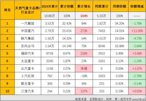 2024年上半年,国内天然气重卡市场累计销售10.88万辆,同比增长104%,累计销量增幅较5月过后(+127%)缩窄23个百分点,比2023年上半年多销售5.56万辆。