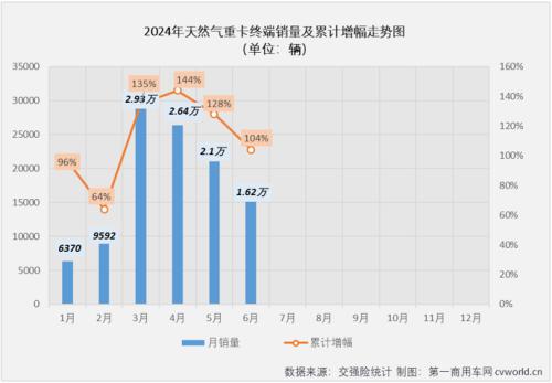 2024年6月份,国内天然气重卡实销1.62万辆,同比增长29%,比2023年6月多销售约3600辆,约是去年同期销量的1.29倍。