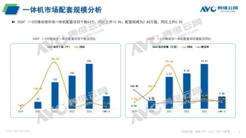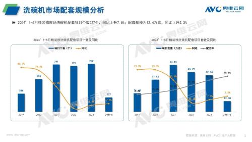 奥维云网(AVC)地产大数据显示,2024年1-5月,商品住宅精装开盘项目总计381个,同比-19.1%,降幅同比收窄7.4个百分点;精装规模22.31万套,同比-23.1%,降幅同比收窄16.4个百分点,精装项目渗透率为32.5%。其中厨电六件套(烟灶消洗、单功能机、一体机)精装配套项目361个,同比-21.5%,降幅同比收窄4.3个百分点,精装规模60.21万套,同比-24.5%,降幅同比收窄10.4个百分点。