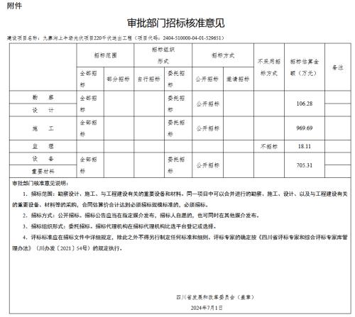 报来《关于核准九寨沟上牛场光伏项目220千伏送出工程项目的请示》(九水电办〔2024〕88号)收悉。经研究,现将九寨沟上牛场光伏项目220千伏送出工程(项目代码:2404-510000-04-01-529651)核准事项批复如下: