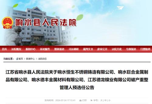 7月24日,江苏省响水县人民法院发布公告称,已立案审查德龙镍业、响水恒生不锈钢铸造有限公司、响水巨合金属制品有限公司、响水德丰金属材料有限公司四家公司破产重整案。法院尚未决定是否最终受理上述案件。