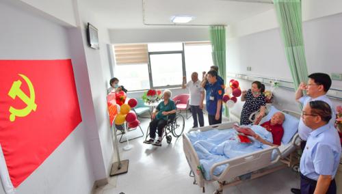 7月1日,党的生日当天,中信重工领导来到洛阳新里程医院病房为离休干部王金钟庆祝100岁生日。据了解,王金钟1922年7月1日出生,1938年加入中国共产党,有着84年党龄。他曾亲历抗日战争、解放战争、抗美援朝战争,1956年进入洛阳矿山机器厂工作。据老人的亲属说,王金钟老人一直保持着共产党员艰苦朴素的作风,一辈子没过过生日。2021年7月1日,老人第一次吐露了心声:希望到100岁时,和党一起过生日。图为当天,王金钟在女儿的协助下庄严举起右手,面向鲜艳的党旗和现场党员们一起重温入党誓词。(黄政伟摄)