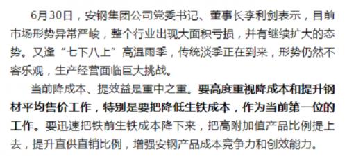 7月11日,在沙钢集团半年度工作会议上,沙钢集团党委书记、董事局常务执行董事、有限公司董事长沈彬深刻剖析了当前钢铁行业面临的严峻形势,明确提出要全面投入、深挖潜力,奋力打好降本节支挖潜增效攻坚战,在全集团吹响了全面降本增效的“集结号”。