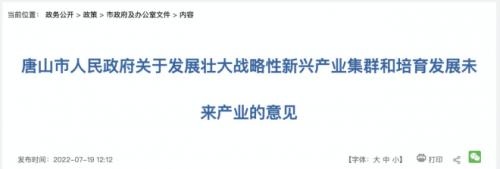 7月19日,唐山市人民政府网站发布了《唐山市人民政府关于发展壮大战略性新兴产业集群和培育发展未来产业的意见》(以下简称“《意见》”),《意见》明确了战略性新兴产业重点发展大数据、新能源、新材料、节能环保、电子信息、应急装备、生物医药、轨道交通装备、机器人、智能印机、新能源汽车及零部件、动力电池、海洋工程、再制造等14个产业集群,谋划发展基因技术、空天技术、氢能、区块链等4大未来产业。