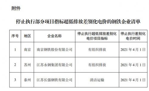 根据《省发展改革委省生态环境厅关于对钢铁企业实施超低排放差别化电价政策的通知》(苏发改价格发〔2020〕1135号)规定及《省生态环境厅关于印送2021年4月执行超低排放差别化电价钢铁企业项目清单的函》(苏环便函〔2021〕351号),现研究决定,对已完成“有组织排放”改造和评估监测的南京钢铁股份有限公司和江苏永钢集团有限公司,已完成“清洁运输”改造和评估监测的江苏长强钢铁有限公司停止执行部分项目指标超低排放差别化电价(具体清单详见附件)。