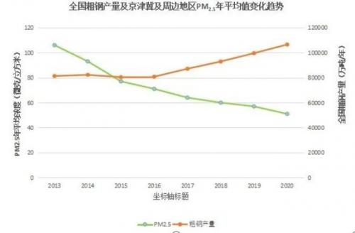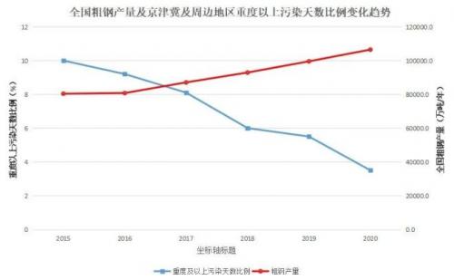 自2013年以来,我国钢铁行业获得了巨大发展,粗钢产量从81313.89万吨增长至106476.7万吨,涨幅达27.31%,其中京津冀地区钢铁产能占比30%。同时我国环境空气质量得到明显改善,2021年,全国339个城市优良天数比率平均为87.5%,同比上升0.5个百分点;PM2.5浓度平均为30微克/立方米,同比下降9.1%。全国平均霾日数21.3天,较2020年减少2.9天,较2016年减少16.6天;全国PM10、PM2.5平均浓度分别为54微克/立方米和30微克/立方米,较2020年分别降低3.6%、9.1%。京津冀周边地区2020年PM2.5平均浓度较2013年下降51.87%;重度及以上污染天气比例较2015年下降65%,见图1和图2。