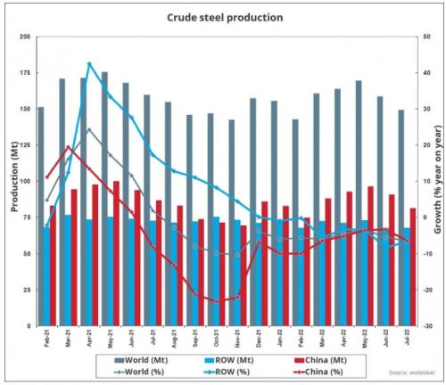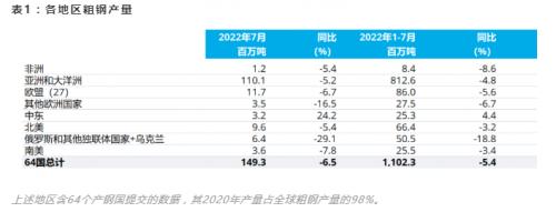 2022年7月全球64个纳入世界钢铁协会统计国家的粗钢产量为1.493亿吨,同比下降6.5%。