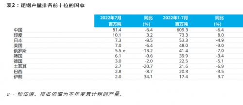 2022年7月,中国粗钢产量为8140万吨,同比下降6.4%;