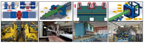 创新点五、研制出大口径厚壁不锈钢焊管成套装备,构建了非对称布置的板边预弯、管体连续折弯等关键结构形式,实现了工艺与设备的集成创新,形成Φ219-Φ1219mm、壁厚80mm、长度12500mm系列产品生产技术,效率提高2倍以上。