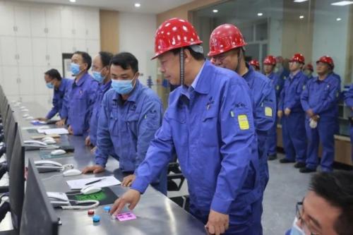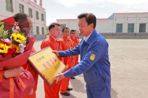 2022年4月24日,酒钢集团党委书记、董事长陈得信“送奖上岗”现场。(酒钢供图)