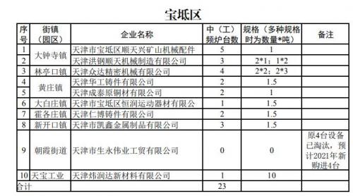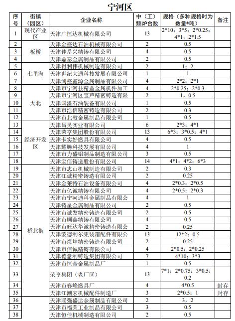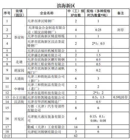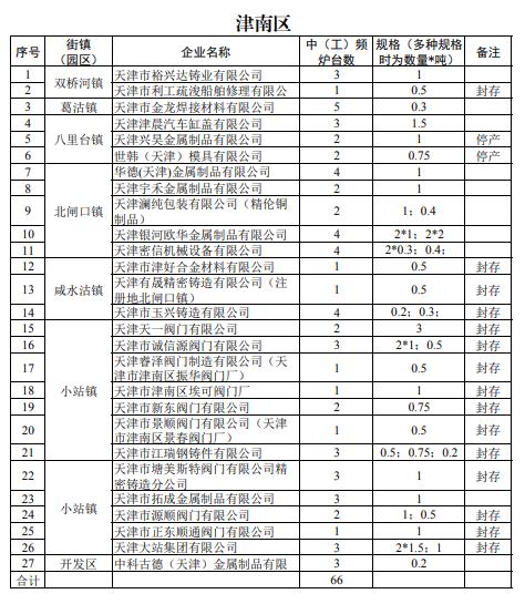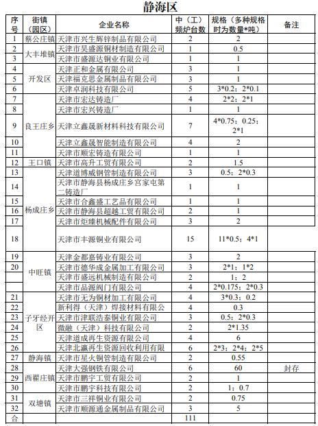 为贯彻落实《天津市人民政府办公厅关于印发天津市严防“地条钢”死灰复燃工作实施方案的通知》(津政办函〔2018〕19号,以下简称《通知》)和国家相关部委严防“地条钢”死灰复燃工作要求,我市开展了2020年中(工)频炉清单更新工作,在各区大力支持下,各区均已开展了大量核实排查工作,形成了本区中(工)频炉的炉体清单。