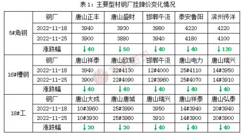 成都钢铁网资讯11月25日消息:本周焦点:对于后续走势型价将再现有局面上震荡下调。目前钢铁原料市场铁矿石与焦炭,出现不同程度拉涨,加上期货带到,市场预期存在带动现货市场价格走高。淡季效应延续需求维持现状,虽有各地政策推动难抵季节效应预期。综上,型价或将在现有局面上震荡弱势下调。【内容提要】◆本周全国型市趋弱运行◆唐山型钢钢企开工率大幅下降◆上海市场库存量小幅增加◆型钢厂理论利润空间小幅下降◆预计下周型价震荡弱势运行一、市场行情回顾