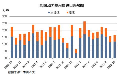 泰国海关最新数据显示,2022年10月份,泰国动力煤(包括烟煤和次烟煤)进口量168.13万吨,同比增加14.97%,环比增长6.14%。