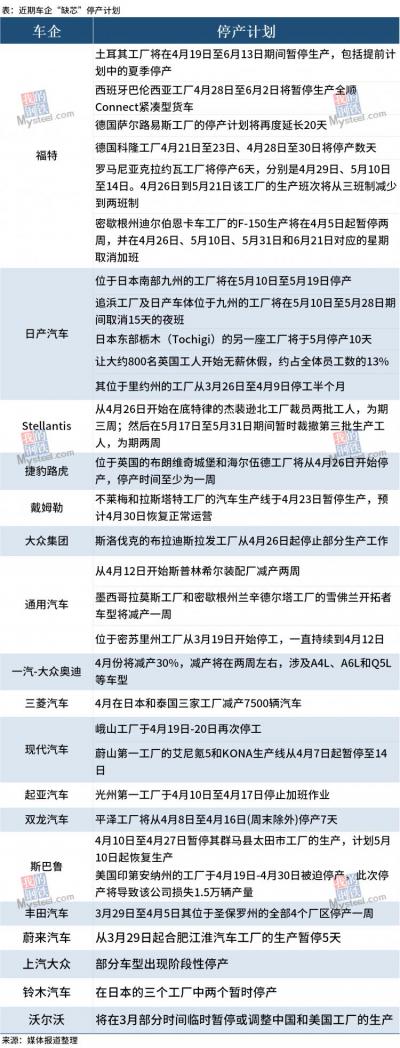 据Mysteel不完全统计,4月以来,受芯片短缺影响,福特、日产、大众、通用等18家车企发布其工厂停产计划。其中一汽-大众奥迪传出4月将减产30%,减产数量或超2万台,涉及A4L、A6L等主力车型;上汽大众4月初表示受到芯片短缺的影响,部分车型出现阶段性停产;福特4月22日宣布大幅削减其欧洲工厂的产量,包括土耳其工厂、德国萨尔路易斯工厂、西班牙巴伦西亚工厂等。