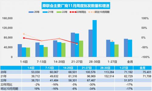 11月1-27日,乘用车市场零售123.0万辆,同比去年下降14%,较上月同期下降15%;全国乘用车厂商批发140.3万辆,同比去年下降17%,较上月同期下降17%。