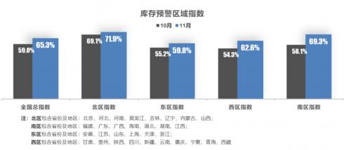 从区域指数情况看:调查显示,11月全国总指数为65.3%,北区指数为71.9%,东区指数为59.8%,西区指数为62.6%,南区指数为69.3%。广东、北京、河南等汽车销量大省,受疫情影响抑制汽车销量,导致库存预警区域指数较高。