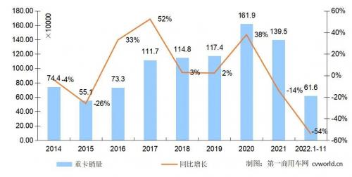 尽管去年同期的销量是当年最低点,但2022年11月份的重卡行业,仍然徘徊在下降通道。第一商用车网获悉,今年11月,我国重卡市场销量预计下降12%,四季度的情况不容乐观。