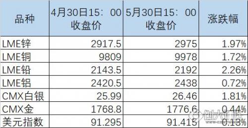 五一劳动节期间,国外锌及基本金属价格以上涨为主,但是上涨幅度受到美财政部长耶鲁加息言论影响,美元指数先弱后强。而期间欧元区等公布的经济数据较好,经济状况的预期改善支持基本金属价格走强。