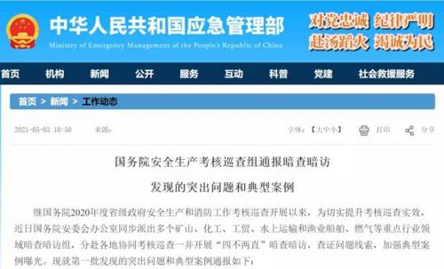 继国务院2020年度省级政府安全生产和消防工作考核巡查开展以来,为切实提升考核巡查实效,近日国务院安委会办公室同步派出多个矿山、化工、工贸、水上运输和渔业船舶、燃气等重点行业领域暗查暗访组,分赴各地协同考核巡查一并开展“四不两直”暗查暗访,查证问题线索,加强典型案例曝光。5月3日,应急管理部网站发布第一批在暗查暗访中发现的突出问题和典型案例通报。