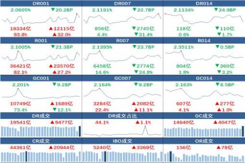 具体来看:DR001、R001加权平均利率分别跌20.2BP、21.3BP,报2.0605%、2.1005%;成交量分别增加12115亿元、23570亿元。DR007、R007加权平均利率分别下行22.7BP、23.7BP,报2.1191%、2.1395%;成交额分别减少2745亿元、2774亿元。