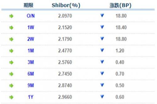 6日上海银行间同业拆放利率(Shibor)全线下行。其中,隔夜Shibor跌18.8BP,报2.0970%;7天Shibor跌18.4BP,报2.1520%;14天Shibor跌18.8BP,报2.1790%。
