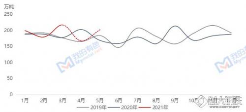 由于部分原定4月到港/清关船只推迟到5月份,因此5月份中国铜精矿进口量Mysteel预测初值为202万吨,环比增加21%。据Mysteel统计的铜精矿到港数据,部分港口5月到港量环比增加66%。预计铜精矿库存也会相应增加。