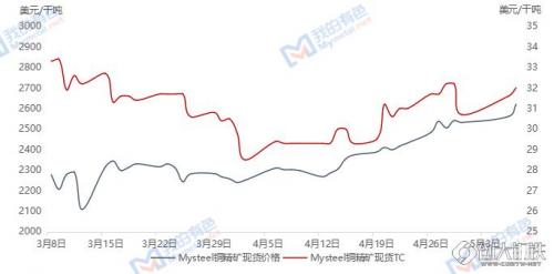 5月7日,Mysteel铜精矿TC 32美元/干吨(QP M+3)。现货市场中,贸易商-冶炼厂主流成交在32-33美元/干吨左右(QP M+1/2/4),也有听说更高的TC成交价,买方尝试寻求30美元中位的价格。五一节后,现货市场交投略有回落,目前7月船期的货源仍然不多,市场观望中。