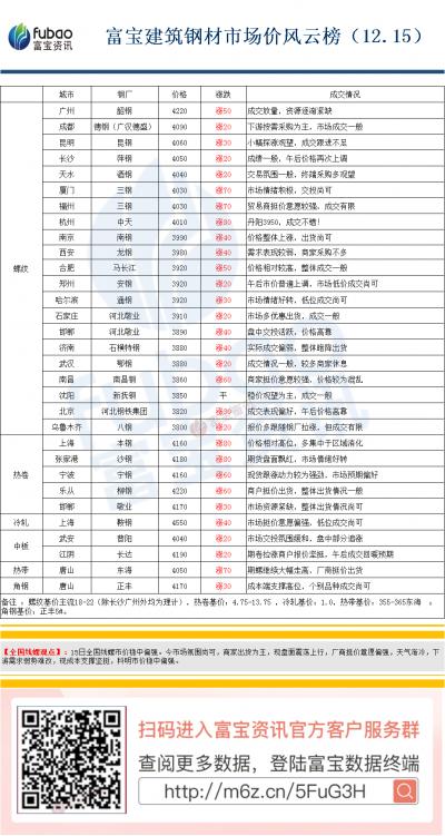 二、产业行情最新消息废钢:昨日全国废钢偏强运行,不断宏观利好刺激盘面冲高,钢材现货市场跟随挺价拉涨,市场情绪提振,整体出货节奏放缓,考虑到市场资源偏紧,多数钢企仍有备库冬储需求,废钢价格尚有支撑,预计短期废钢窄幅偏强运行。钢坯:15日唐山钢坯涨80报3810元/吨,目前唐山本地及周边部分钢厂普碳方坯报3810元/吨,秦皇岛卢龙钢厂普碳方坯涨80报3810元/吨均含税出厂。宏观利好因素刺激下,市场盼涨情绪浓厚,下游采买坯料积极性有所恢复,贸易商心态尚可,午后仓储现货部分报3900元含税,较晨高报30元,预计短期钢坯价格偏强整理。铁矿石:16日唐山铁精粉市场主稳个涨,矿企看涨高要,但钢企消耗库存为主,谨慎观望。山西铁精粉市场主稳运行,交投偏弱,个别矿选有复产意向,但原矿资源短缺明显。焦炭:15日临汾一级湿熄焦出厂含税2750元/吨;唐山准一级湿熄焦含税到厂2720元/吨;潍坊准一级干熄焦出厂含税3110元/吨。国内焦炭市场稳中偏强运行,山西个别焦企对焦炭价格进行上调,干熄焦上调110元/吨,自12月16日起执行。供应方面,受利润逐步修复影响,加之原料到货情况有所转好,产地焦企开工率稍有提升,然考虑到原料煤价格仍在不断上涨,焦企入炉煤成本较高,部分焦企利润依旧处于亏损状态,整体提产积极性一般,同时厂内焦炭库存保持零库存或者低库存水平,焦炭供应仍呈现收紧态势。需求方面,钢厂利润有所改善,生产意愿仍在,加之厂内焦炭库存多在低位,对焦炭补库需求仍存,多积极采购。港口方面,两港库存稳中有增,港口询盘有所增加,但市场实际成交较少。预计短期内焦炭市场稳中偏强运行。三、钢市动态【夜盘收盘一览】