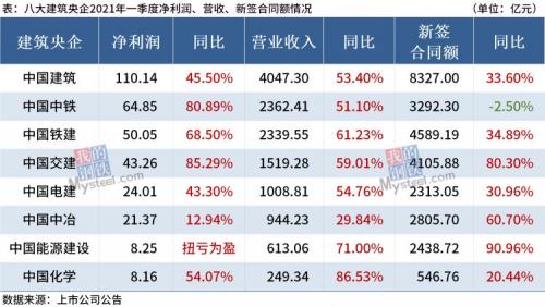 目前,八大建筑央企2021年一季度报告皆已公布。统计结果看,这八家企业一季度经营情况普遍良好。净利润方面,一季度均实现盈利,累计达330.09亿元,其中中国能源建设一季度净利润扭亏为盈;营收方面,一季度总计约13084亿元,超万亿;新签合同额方面,中国建筑、中国铁建、中国交建、中国电建等7家企业同比均为正增长,累计为28418亿元。