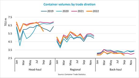 集装箱市场已经受到了全球经济逆风的影响。零售业已趋于平稳,美国零售商们预计今年年底的假日季销量比正常情况低。与此同时,因为工资与通胀不同步,就业率在上升但购买力却在下降,库存在过去的十二个月里创下新高,欧盟和美国企业似乎也开始清仓。在美国,个人储蓄率已经跌破新冠疫情之前的水平;2020年和2021年间积累的超额储蓄正在骤减,而信用卡债务已经达到有记录以来的第二高水平。世界其他地区的消费者和企业也面临着类似的问题,许多国家也在与因本币兑美元汇率贬值而导致的进口价格上涨作斗争。班轮经营人对贸易量的下降做出了反应,他们暂停了服务,增加了空船航行的数量。