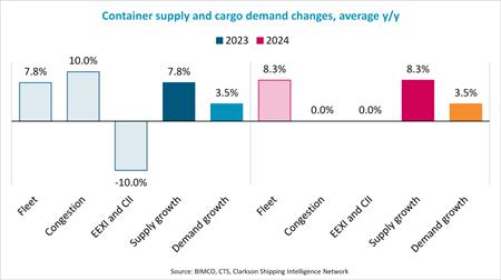 由于需求前景灰暗,船舶供给量的增长明显比需求快,我们预计未来两年的供需平衡都将恶化。如果我们的预测正确,2023年和2024年船舶将供需失衡,差值可能都会达到约100万TEU。